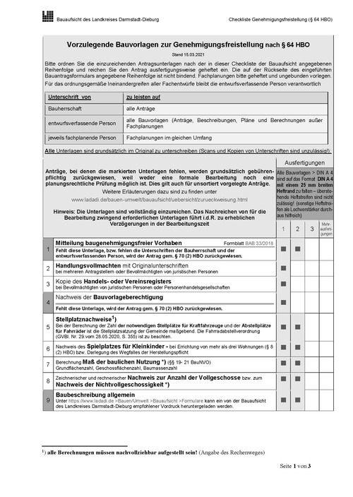 Für ein Bauvorhaben, das alle Anforderungen der Genehmigungsfreistellung erfüllt, sieht der Gesetzgeber die Einreichung der erforderlichen Bauvorlagen bei der Gemeinde vor. Zuständig hierfür ist die Bauaufsicht des Landkreis Darmstadt-Dieburg. Die Bauaufsicht prüft die mitgeteilten Bauvorhaben nicht. Sie kann aber innerhalb eines Monats nach Eingang der Bauvorlagen erklären, dass auch für ein genehmigungsfreigestelltes Bauvorhaben ein Baugenehmigungsverfahren durchgeführt werden soll. Erklärt sie dies nicht innerhalb eines Monats, können Sie mit der Ausführung des Vorhabens beginnen.