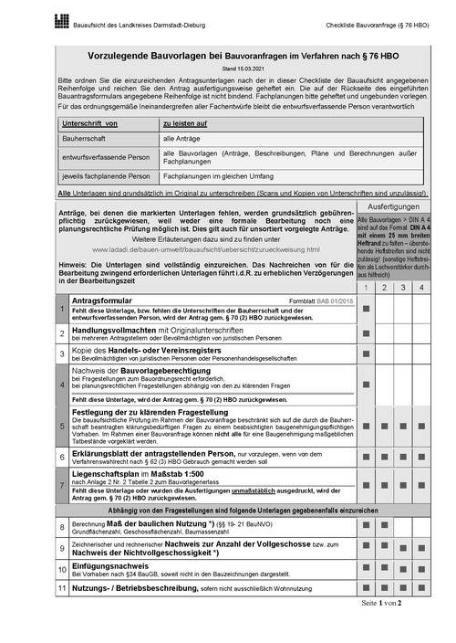 Ob diese Bauvorlagen auch in Ihrem konkreten Einzelfall vorzulegen sind, erfahren Sie bei der Vorberatung durch die Mitarbeiter*innen der Bauaufsicht.