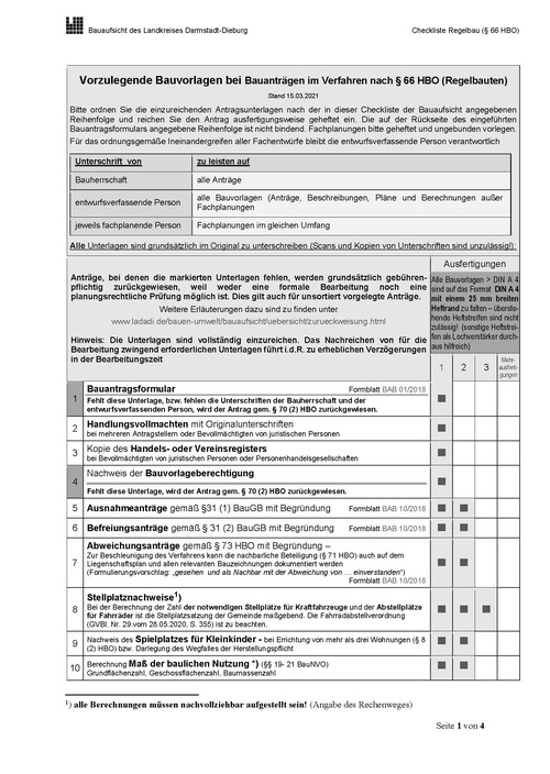 Der Baubeginn ist mindestens 1 Woche vorher der Bauaufsicht des Landkreis Darmstadt-Dieburg schriftlich mitzuteilen. Die Fertigstellung des Rohbaus und die abschließende Fertigstellung des Gebäudes sind der Bauaufsicht mindestens 2 Wochen vorher unter Angabe des Zeitpunkts der Fertigstellung anzuzeigen. Bitte verwenden Sie hierfür die Formulare aus dem Bauvorlagenerlass.