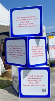 Unsere Werbe-Würfel sind nicht zu übersehen! Ob als einzelner Würfel oder als Turm aus zwei oder drei Würfeln übereinander - unserer Message ist klar: Der Pflegestützpunkt ist für Sie da!