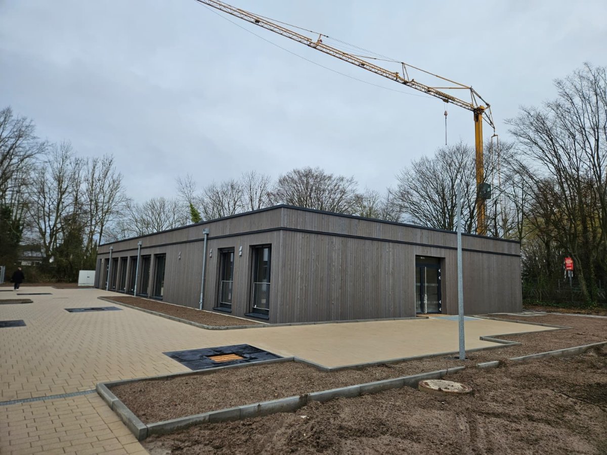 Die Planung für den Erweiterungsbau begann im Mai 2023. Nach dem Abriss des ehemaligen Hausmeisterhauses im Jahr 2024 wurde im April 2025 die Bodenplatte aus Stahlbeton hergestellt. Die vorgefertigten Holzmodule wurden im August 2025 errichtet, anschließend folgten die Ausbauarbeiten. Die endgültige Fertigstellung erfolgt im Februar 2026, die Betriebsaufnahme ist für den 2. März 2026 vorgesehen.