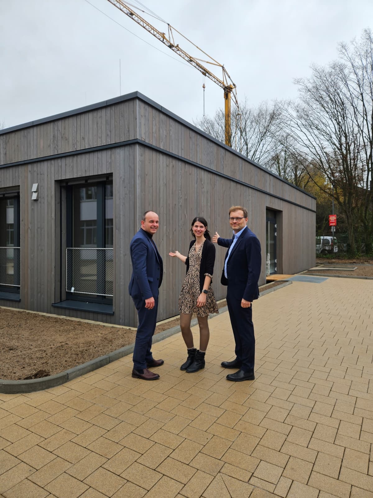 Bild 2: Vize-Landrat Lutz Köhler, Schulleiterin Eva Bell und Bürgermeister Sebastian Bubenzer vor der neuen Mensa.