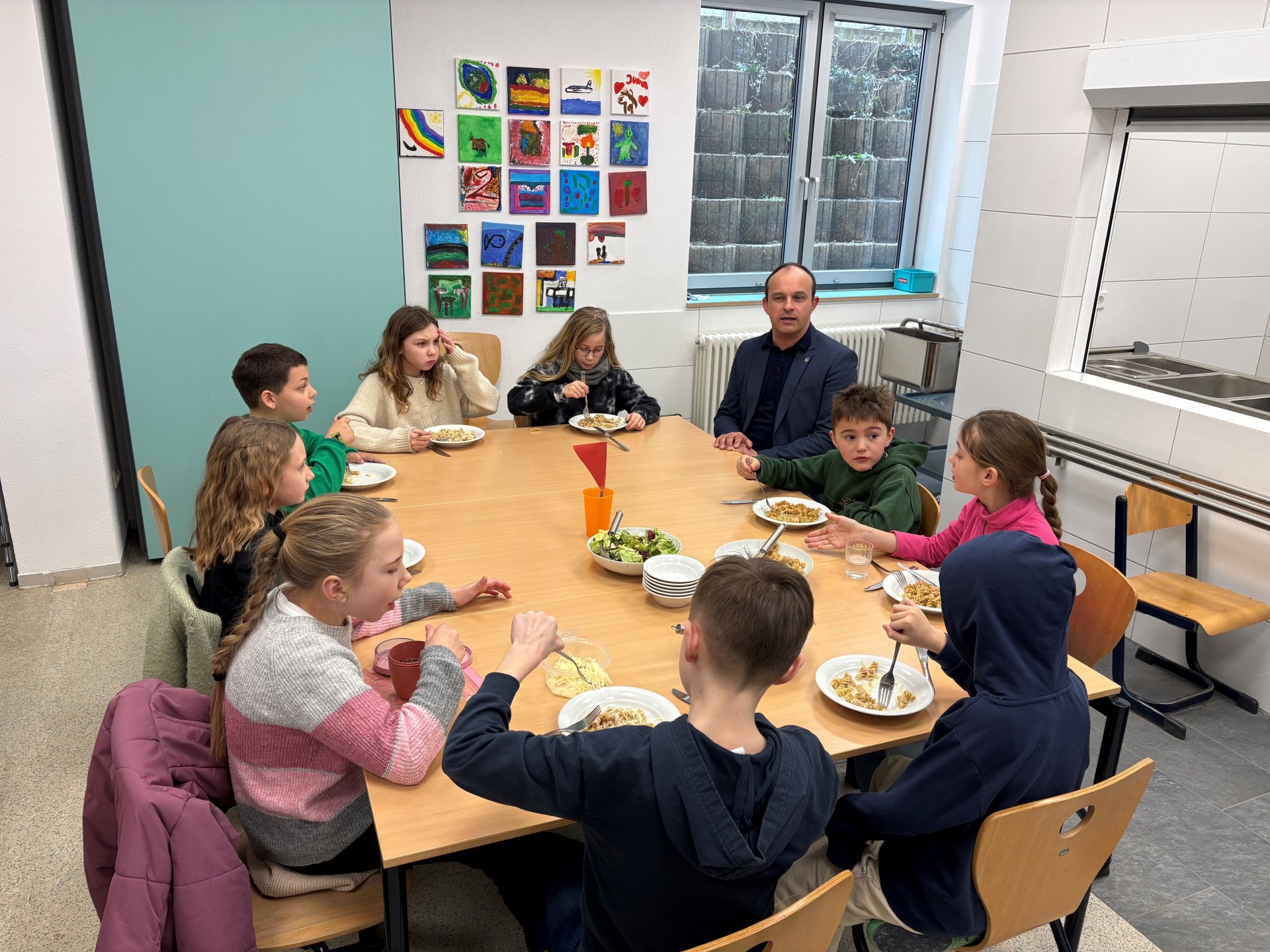 Besonders aufmerksam verfolgt wird das Pilotprojekt „gemeinschaftliches Mittagessen“ oder auch „Familienessen, das sich derzeit in der Erprobungsphase befindet und zum Schuljahresende evaluiert wird. Ziel ist es, das gemeinsame Essen als pädagogischen Raum zu nutzen – für soziales Lernen, Ernährungsbildung und Gemeinschaft. Die Kinder nehmen sich das Essen selbst vom Tisch, sie decken den Tisch und sie räumen auch ab und machen den Tisch sauber. Gleichzeitig können Lebensmittelabfälle reduziert und Entsorgungskosten gesenkt werden. „Ein gutes Mittagessen ist weit mehr als reine Versorgung“, so Lutz Köhler. „Es stärkt Gemeinschaft, fördert Gesundheitsbewusstsein und gehört zu einem gelingenden Ganztag ganz selbstverständlich dazu.“