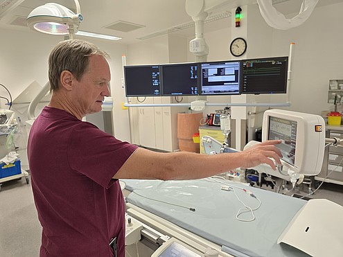 Chefarzt Prof. Dr. Michael Weber im derzeitigen Herzkatheter-Labor an der Kreisklinik Groß-Umstadt. Derzeit entsteht ein neues Labor, das größer und moderner sein wird. Foto: Kreiskliniken Darmstadt-Dieburg