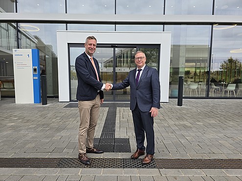 Betriebsleiter Christoph Dahmen (rechts) begrüßt Priv.-Doz. Dr. Markus Paschold vor dem Haupteingang der Kreisklinik in Groß-Umstadt. Paschold übernimmt zum 15. Oktober die Leitung der Klinik für Allgemeinchirurgie. (c) Thomas Bach, Kreisklinken Darmstadt-Dieburg