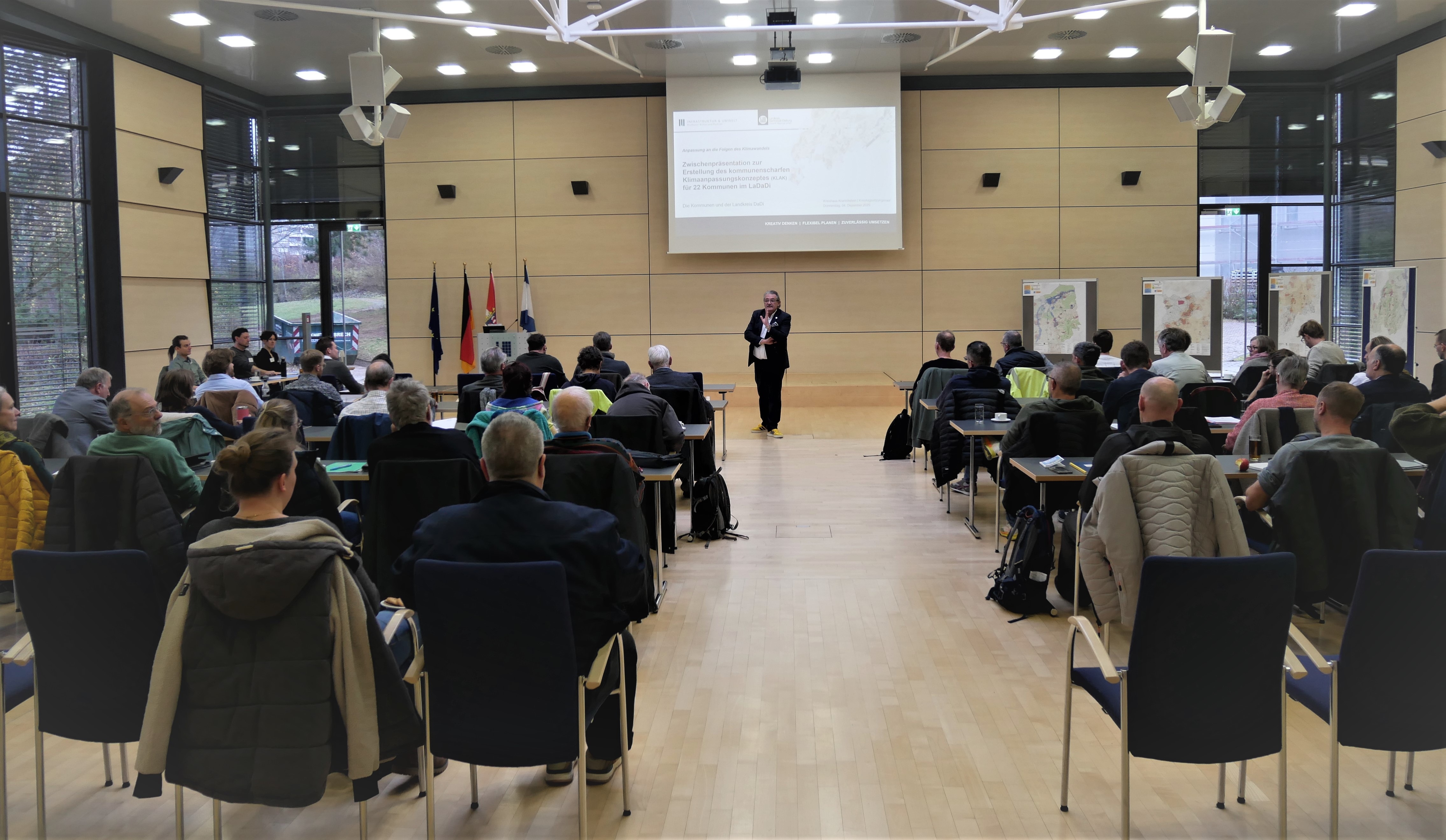 Landrat Klaus Peter Schellhaas eröffnete die Zwischenpräsentation und betonte, dass die Auswirkungen des Klimawandels längst Realität sind und die Kommunen im Landkreis vor wachsende Herausforderungen stellen. (c) INFRASTRUKTUR & UMWELT Professor Böhm und Partner