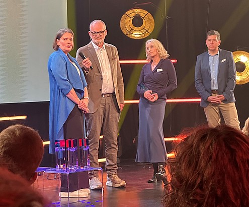 Oberärztin Barbara Jost (links) bei der Verleihung des Bremer Fernsehpreises mit Moderator Frank Plasberg. Rechts sind Autorin Katrin Wegner und hr-Redakteur Philipp Engel zu sehen. Foto: Kreiskliniken Darmstadt-Dieburg