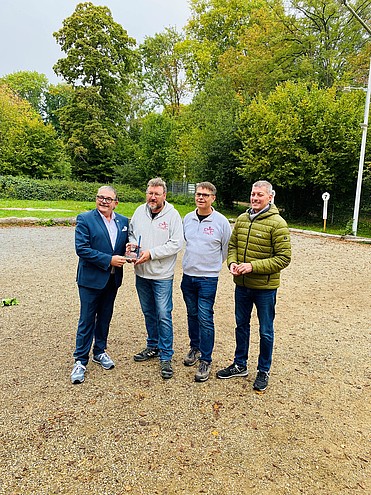 (c) Landkreis Darmstadt-Dieburg: v.l.n.r.: Landrat und Sportdezernent Klaus Peter Schellhaas, Stefan Bonifer, Achim Weißbäcker (Vorsitzender des Pétanque Clubs) und Dieburgs Bürgermeister Frank Haus