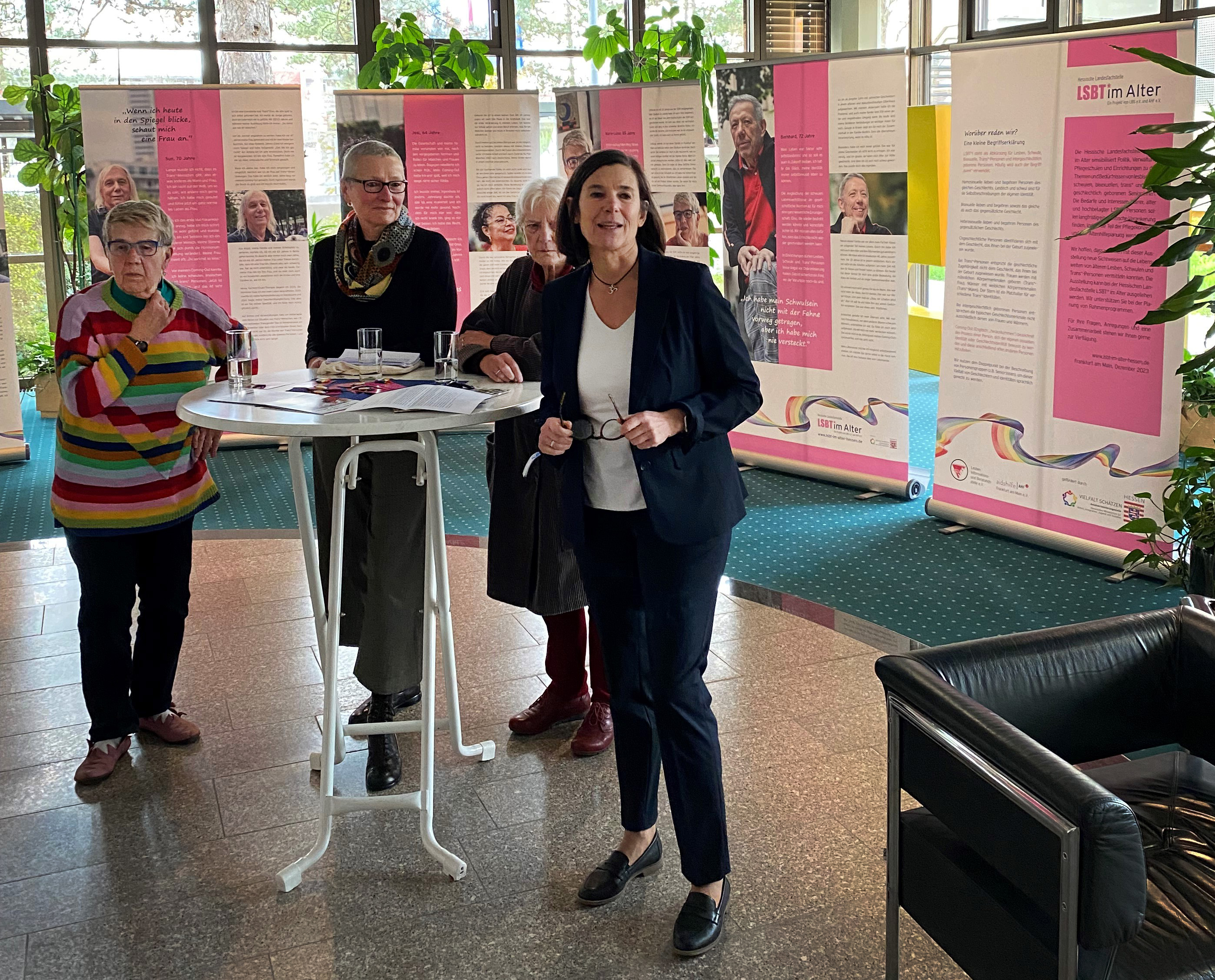 (c) Landkreis Darmstadt-Dieburg I v.l.n.r.: Marie-Luise, Elke Kreß (Hessische Landesfachstelle LSBT* im Alter), Corry und Sozial- und Jugenddezernentin Christel Sprößler bei der Ausstellungseröffnung