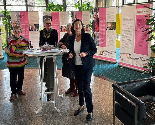 Den Auftakt bildete die Vernissage der Wanderausstellung „Besonders habe ich mich immer gefühlt“. Die Ausstellung der Hessischen Landesfachstelle LSBT im Alter porträtiert sieben Menschen zwischen 64 und 85 Jahren, die schwul, lesbisch oder trans* sind und gewährt sehr persönliche Einblicke in ihr Leben. Sie zeigt auf eindrucksvolle Weise die Wünsche, Erwartungen und Ängste von LSBT-Seniorinnen und Senioren. Stimmen, die in unserer Gesellschaft oft überhört werden. Dass ältere LSBT*-Personen oft unsichtbar bleiben, zeigt sich auch darin, dass ihre Lebenssituation kaum wissenschaftlich erforscht ist. Elke Kreß, Fachreferentin bei der Hessischen Landesfachstelle LSBT im Alter, macht darauf aufmerksam: „Wir wissen bis heute nicht genau, wie viele lesbische, schwule oder transgeschlechtliche Menschen in Deutschland leben – und noch weniger über ihre Lebenslagen im Alter. Diese Unsichtbarkeit erschwert nicht nur gesellschaftliche Akzeptanz, sondern auch eine angemessene Unterstützung in Pflege und Betreuung.“